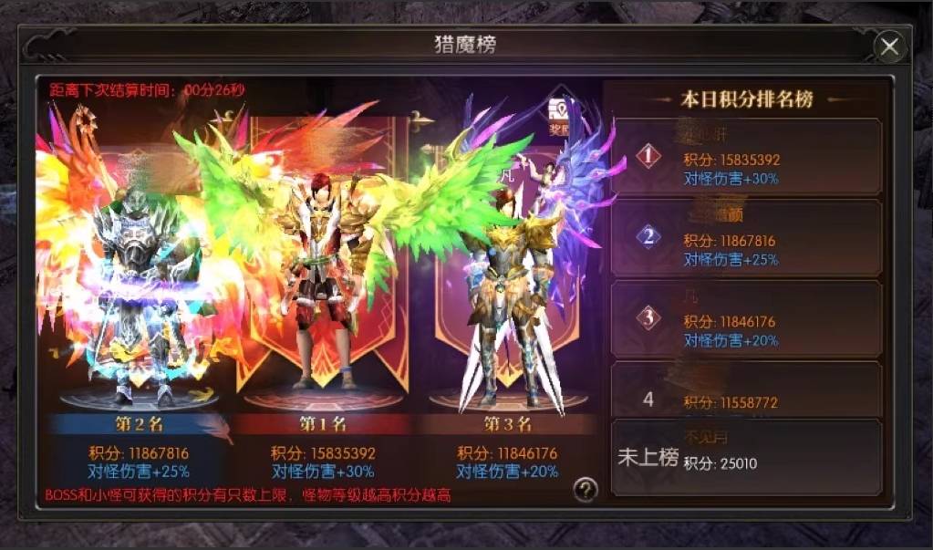 每日猎魔榜更新,都会有对怪伤害加成,排名越高,加伤越多,让差距从一点点开始变大。