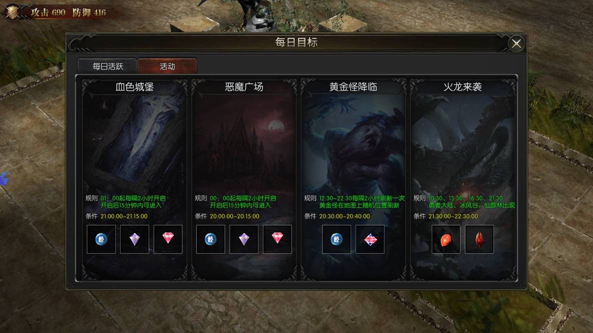 血色城堡和恶魔广场:参与这两个日常副本能够获得大量的经验和装备。注意副本的开启时间和难度系数,合理安排时间参与。在副本中使用经验加成卡能够显著提高经验收益。