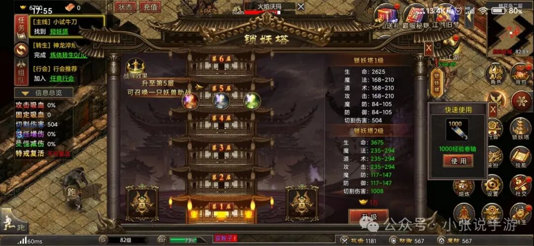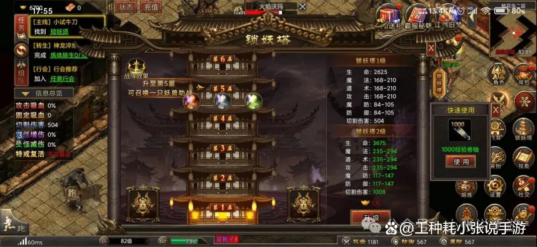 利用福利,获取赞助,接着完成一些任务,将锁妖塔提升至5级,这样就会有一只骷髅随同作战,根据个人喜好的组合效果,选择骷髅,然后继续进行主线任务,这个升级战斗力非常迅速,如果要打boss,就前往boss之家或者玛雅神殿,前期boss刷新速度很快,每30秒刷新一个。